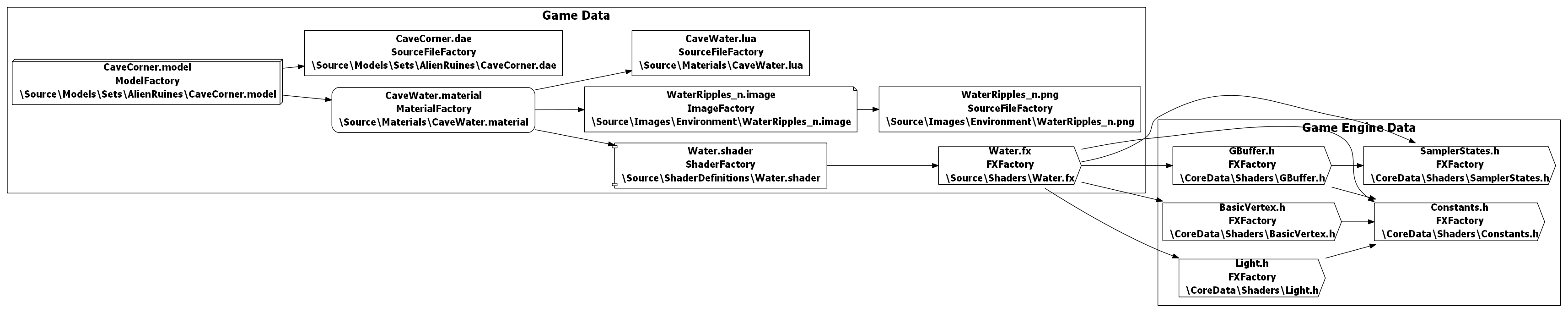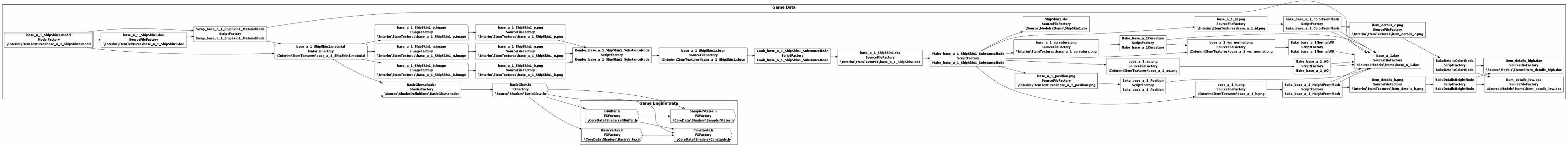 So, what I already have is a Lua scripted build pipeline. My assets are added to the build via script, this creates a dependency tree that then resolves any dynamic dependencies, and builds everything in the correct order. This system is used to build all my game data, and is the logical place to add in my Substance Designer Pipeline. The example above shows a build for a typical model. It has dependencies on the source model, and materials. These in turn have dependencies on shaders and textures. The build pipeline also has the ability to save out information for the game to access. It can, for example, tell the game where to find all the models to use for generating weapons and items.